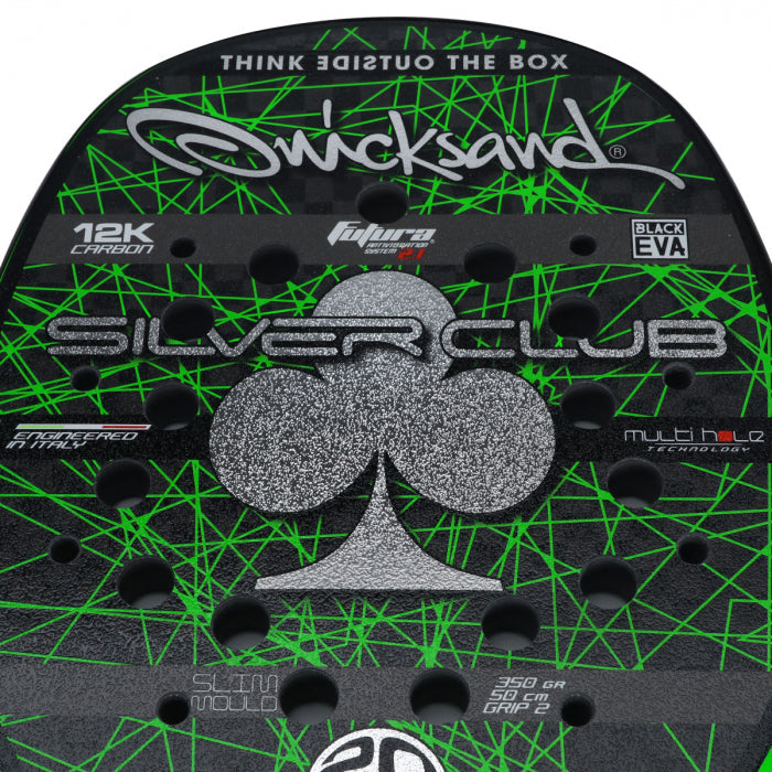 A Quicksand foi fundada em 2008 na ITÁLIA, por dois jogadores profissionais que decidiram fazer da sua enorme paixão um trabalho real. A marca tem um apelo forte, graças a uma imagem jovem e de produtos de alta qualidade. Após alguns anos a Quicksand decide investir em tecnologia, assim nasceu o projeto FUTURA SYSTEM, que abriu em definitivo as portas do mercado mundial. Ateste a qualidade da marca através da Raquete de Beach Tennis Quicksand Silver Club, ela possui o exclusivo e patenteado FUTURA SYSTEM, um dispositivo tecnológico que permite uma redução consistente das vibrações causadas pelo impacto contínuo da bola, amenizando traumas do pulso, de cotovelo e de ombro, ao mesmo tempo em que mantém a raquete no mais alto nível de jogo.